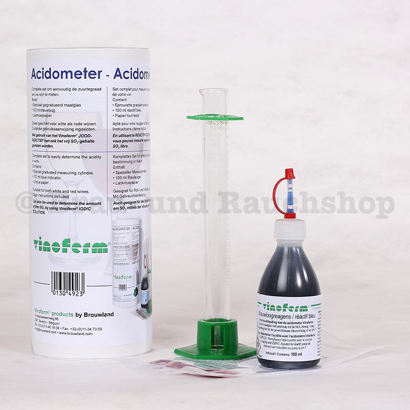 Komplettes Set für eine schnelle Säurebestimmung in Rot- und Weißwein in 3 Schritten: Wein abmessen, Blaulauge beifügen, Säuregehalt direkt ablesen! Enthält 1 speziellen Messzylinder, 1 Flasche Vinoferm® Blaulauge und Lackmuspapier. Sehr einfach zu verwenden. Mit Gebrauchsanleitung! Auch geeignet für die Bestimmung von freiem Sulfit, aber dann mit einer Jodlösung (013.056.7).