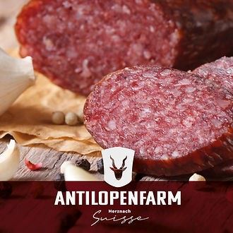 *Antilopenfelisch, Schwienefleisch, Knoblauch, Pökelsalz, Gewürze, Traubenzucker, Antioxidationsmittel, Geschmacksverstärker *Im Naturdarm.