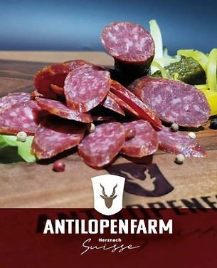 Antilopenfleisch, Schwienefleisch, Speck, Pökelsalz, Gewürze, Traubenzucker, Antioxidationsmittel, Geschmacksverstärker *Im Naturdarm.