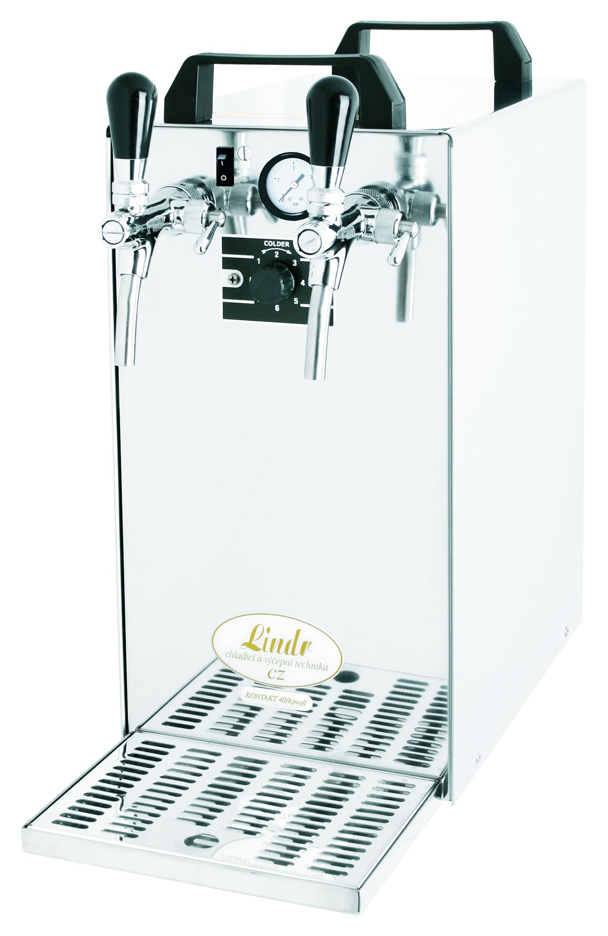 KEG-PRESSURISIERUNG - MODELL KONTAKT 40/Kprofi NEW ist mit einem einzigartigen System eines eingebauten, leisen, hochwertigen Luftkompressors ausgestattet, der mit einem Geräuschdämpfer und einem Molekülfilter für die einströmende Luft versehen ist. Der Kühler ist mit einer Druckregelung von 1-3,6 bar und einem Manometer ausgestattet.
