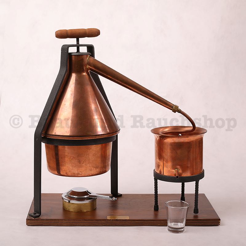 Zur Gewinnung von Aromastoffen und flüchtigen Substanzen durch Destillation. Komplette Ausführung mit Brennhafen, Kühler und Spiritusbrenner montiert auf Holzrahmen.