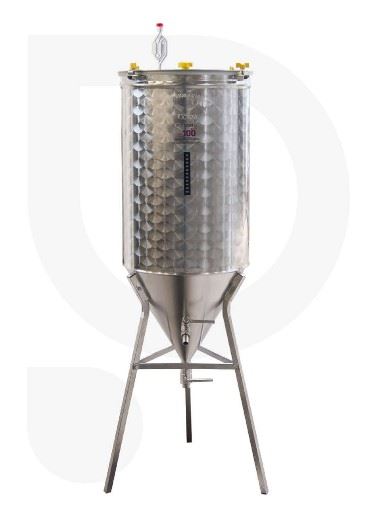 Der sich um 60° verjüngende Boden erleichtert das Absaugen von Hefen und Sedimenten, die sich am Boden des Kegels absetzen, und ermöglicht so eine größere Sauberkeit und vermeidet das Absetzen, das häufig Infektionen verursacht. Bei dieser Lösung bleibt das Bier so wenig wie möglich mit der erschöpften Hefe in Kontakt. TIG-Schweißnähte erleichtern Reinigungs- und Desinfektionsvorgänge. Der Tank ist mit einem dicken Deckel mit lebensmittelechter Silikondichtung und Flügelschrauben zum Festziehen der Dichtungsbügel verschlossen. Hervorragende Stabilität dank des integrierten Sockels.