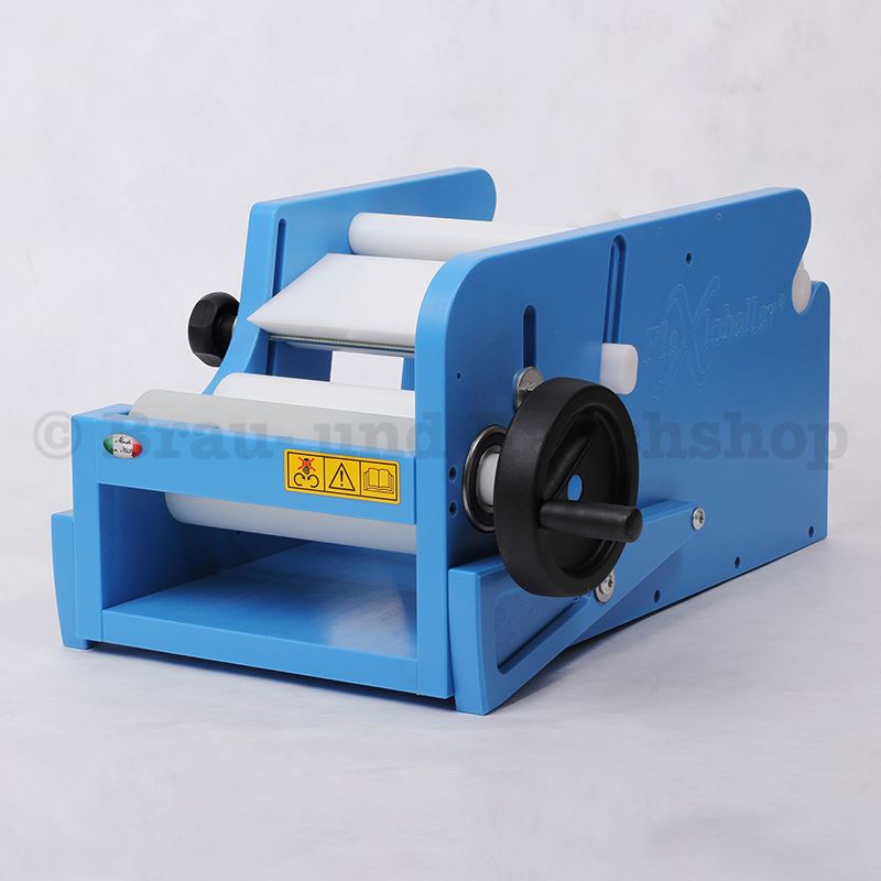 Einfaches Etikettiergrät für Selbstklebe-Etiketten auf zyl. Flaschen und Dosen.Antrieb: Kurbel Flaschendurchmesser: von 50 - 120mm Leistung: ca.350 - 450 Fl/h.