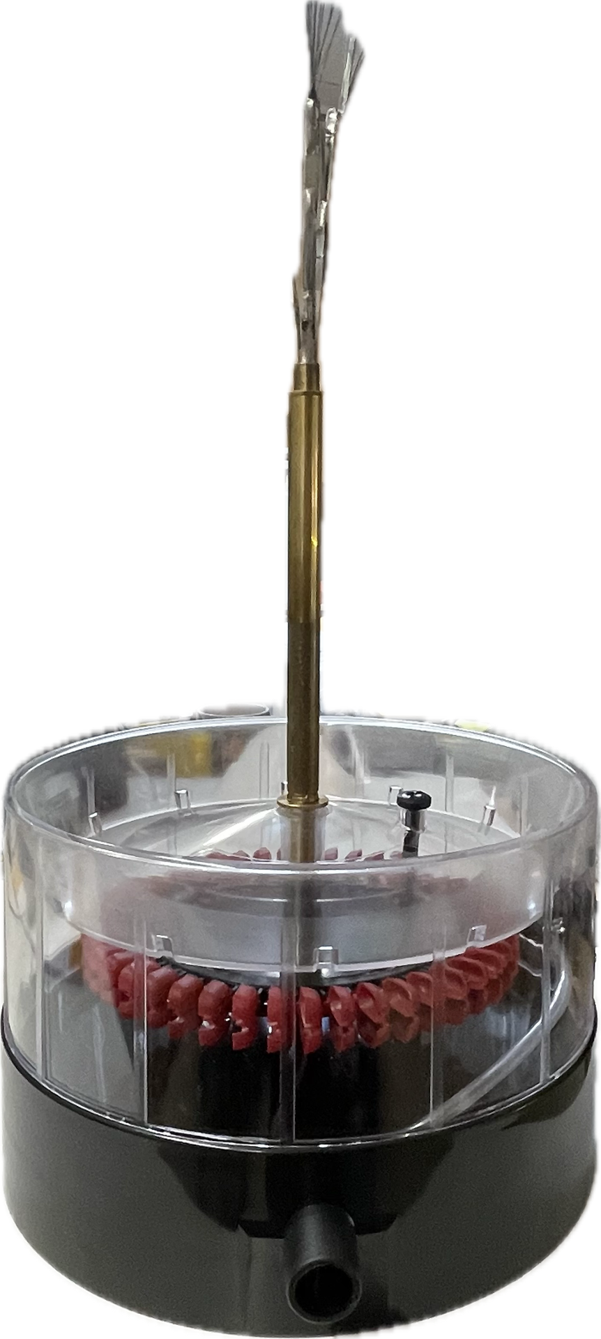 Die Innenbürste aus Metall dreht getrieben vom Wasserdruck kräftig im Kreis. Sie brauchen keine Elektrizität! Damit sich der Wasserdruck nicht aufstaut läuft auch bei geschlossenem Hahn etwas Wasser