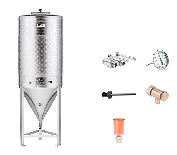 Zur Vergärung kleinerer Mengen Bier empfiehlt sich der Gärtank FD-ZKG. Er steht stabil und sicher auf drei Füßen. Auch der FD-ZKG ist komplett aus Edelstahl gefertigt und seine spezielle 3D-Innenoberfläche erleichtert die Reinigung ungemein.
