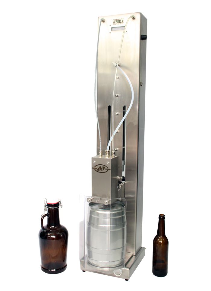 - Mit ihm lassen sich Glasflaschen (0,25l bis 0,75l), Siphons und Fässer (5l) befüllen; auf Anfrage auch PET-Flaschen.- Die Füllgeschwindigkeit kann durch eine Drossel stufenlos von 0,5 bis 2l/min eingestellt werden.- Pro Stunde können etwa 150 Flaschen à 0,5l abgefüllt werden.