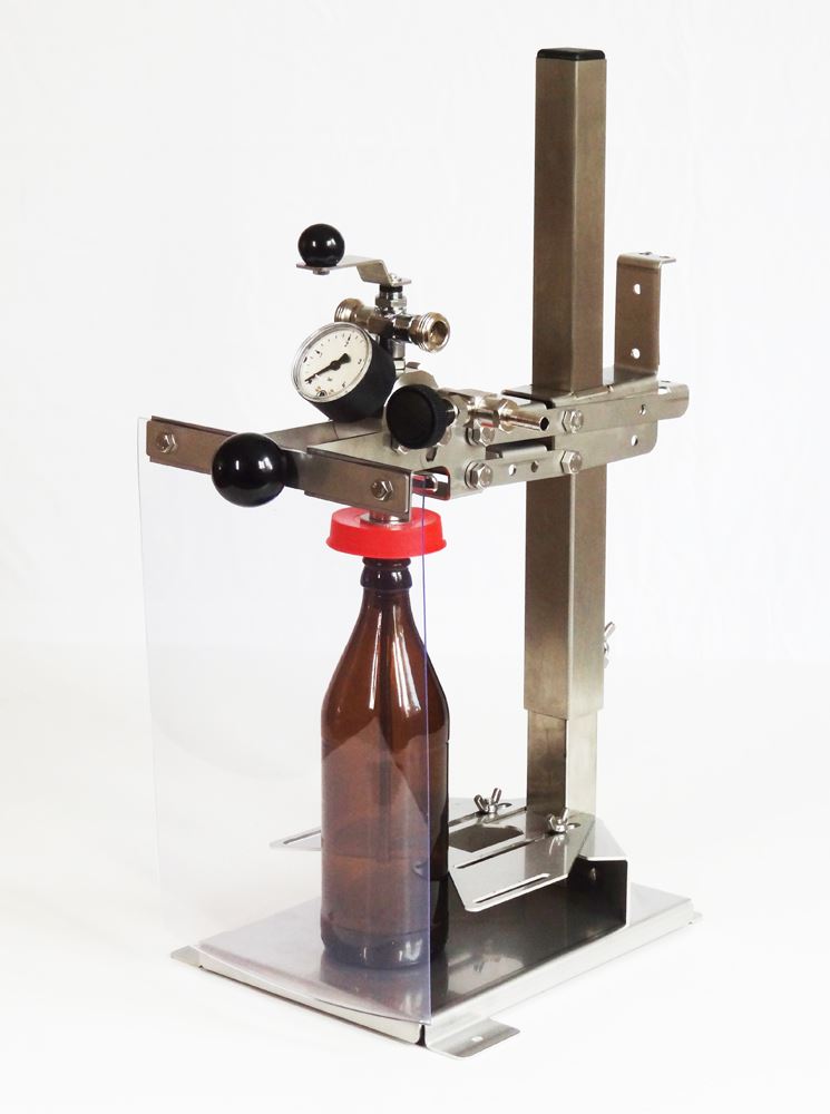 Leere Flasche wie bereits beschrieben auf das Füllorgan des Füllers aufschieben und die Flasche gegen den Anschlag auf der Grundplatte abstellen. Bitte darauf achten das alle Ventile geschlossen sind.