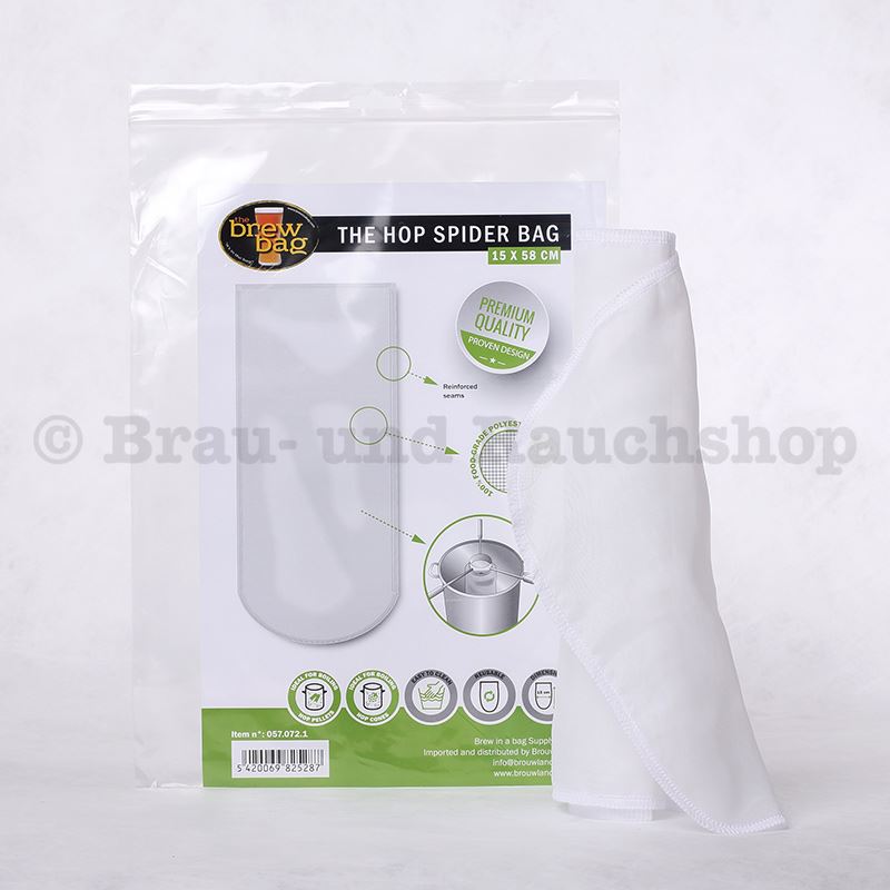 Der „Hop Spider Bag“ sorgt dafür, dass Hopfenteilchen Ihren Braukessel nicht verstopfen. Er trennt die Hopfenteilchen von der Würze im Gärbehälter, was bedeutet, dass Sie weniger Trub haben beim Abfüllen.Auch geeignet für kürzere Kessel: rollen Sie einfach die Oberseite des Hop Spider Bags nach unten und befestigen Sie Ihn an Ihren Hop Spider. Ein Hop Spider hält den Sack offen für zusätzliche Hopfengaben während des Kochens.