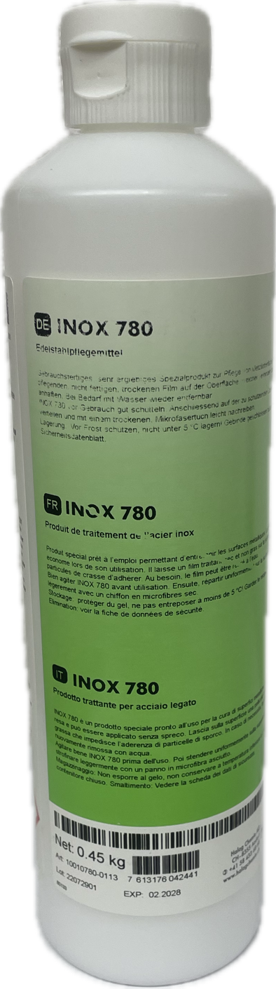 INOX 780 ist ein gebrauchsfertiges Spezialprodukt zur Pflege von Metalloberflächen. Das Produkt ist sehr ergiebig und sparsam in der Anwendung. Es hinterlässt einen pflegenden, nicht fettigen, trockenen Film auf der Oberfläche, welcher verhindert, dass Schmutzpartikel anhaften. Behandelte Oberflächen zeigen ein samtiges, homogenes Erscheinungsbild. Bei Bedarf lässt sich der Film mit Wasser wieder entfernen. Für die Pflege in Lebensmittelbetrieben geeignet. Nur für die gewerbliche Anwendung.