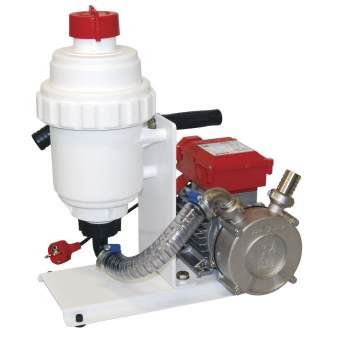 Neuer preisgünstiger Korbfilter mit Elektropumpe, speziell als Vorfilter für flüssige Lebensmittel wie Most, Fruchtsäfte, leicht alkoholische Kräuterextrakte usw. konzipiert. Praktische kompakte Ausführung mit Handgriff. Großes Edelstahl-Korbsieb, Feinheit 200 µ.