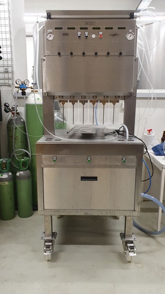 Die Anlage wurde 2019 gebaut und 3 Jahre betrieben. Halbautomatische Gegendruck-Abfüllanlage für CO2-haltige Getränke (Bier, Sekt, Cider, etc.) mit 3-mal 6 Flaschenstationen, mit Flaschenspüler, Flaschenfüller und Verkorker - pneumatisch betrieben.