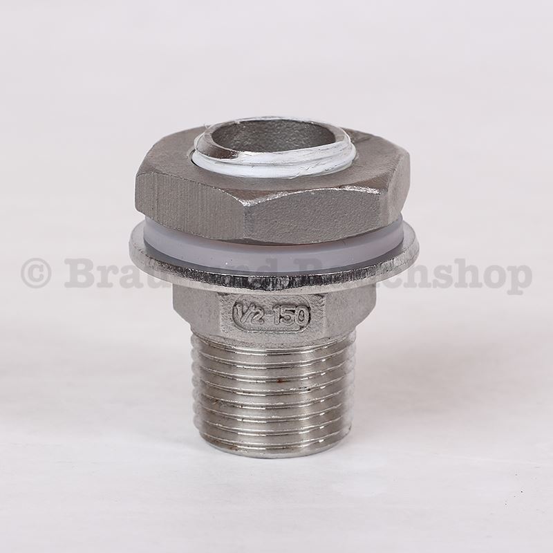 Bohren Sie ein Loch, schrauben Sie die Schottverschraubung in den Braukessel fest und montieren Sie den Hahn. Auf der Innenseite ermöglicht das verlängerte Gewindeteil die Montage zusätzlicher Teile.